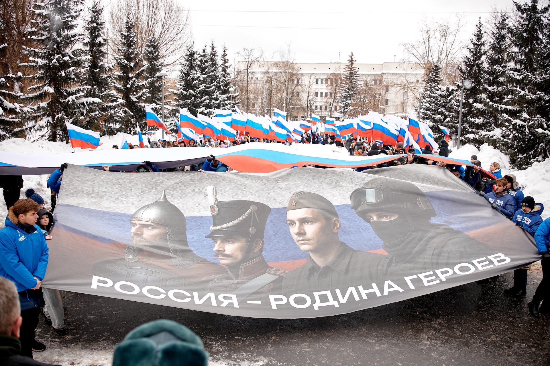 В рамках акции участники возложили цветы к мемориалу «Рабочий и солдат», развернули государственный флаг России и баннер с образами портретами героев прошлого и современности и исполнили гимн Российской Федерации.